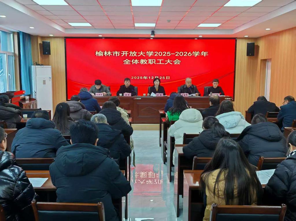 12月25日上午,榆林市开放大学2025-2026学年全体教职工大会在庄严的国歌声中隆重开幕。大会凝聚全校共识,共谋发展新篇,全体教职工齐聚一堂,共商学校改革发展大计。市教育工会主席刘艳、市教育局基教二科副科长朱团员到会指导。校党总支书记丁建伟主持会议。