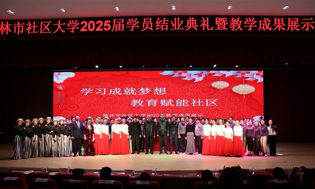 2025年12月30日上午,榆林市开放大学(榆林市社区大学)教学楼二楼多功能报告厅内暖意融融、欢声阵阵,“学习成就梦想,教育赋能社区”2025年学员结业典礼暨教学成果展示活动隆重举行。参加此次活动的有市教育局党组成员李向春、职成科科长白艳梅、各县(市、区)继续教育中心主任、驼峰路办事处、金华路社区、金阳社区、兴中路社区、望湖路社区的领导以及榆林市开放大学(榆林市社区大学)全体师生。大家齐聚一堂,共同见证423名学员圆满完成学业并欣赏了一场精彩教学成果汇演。